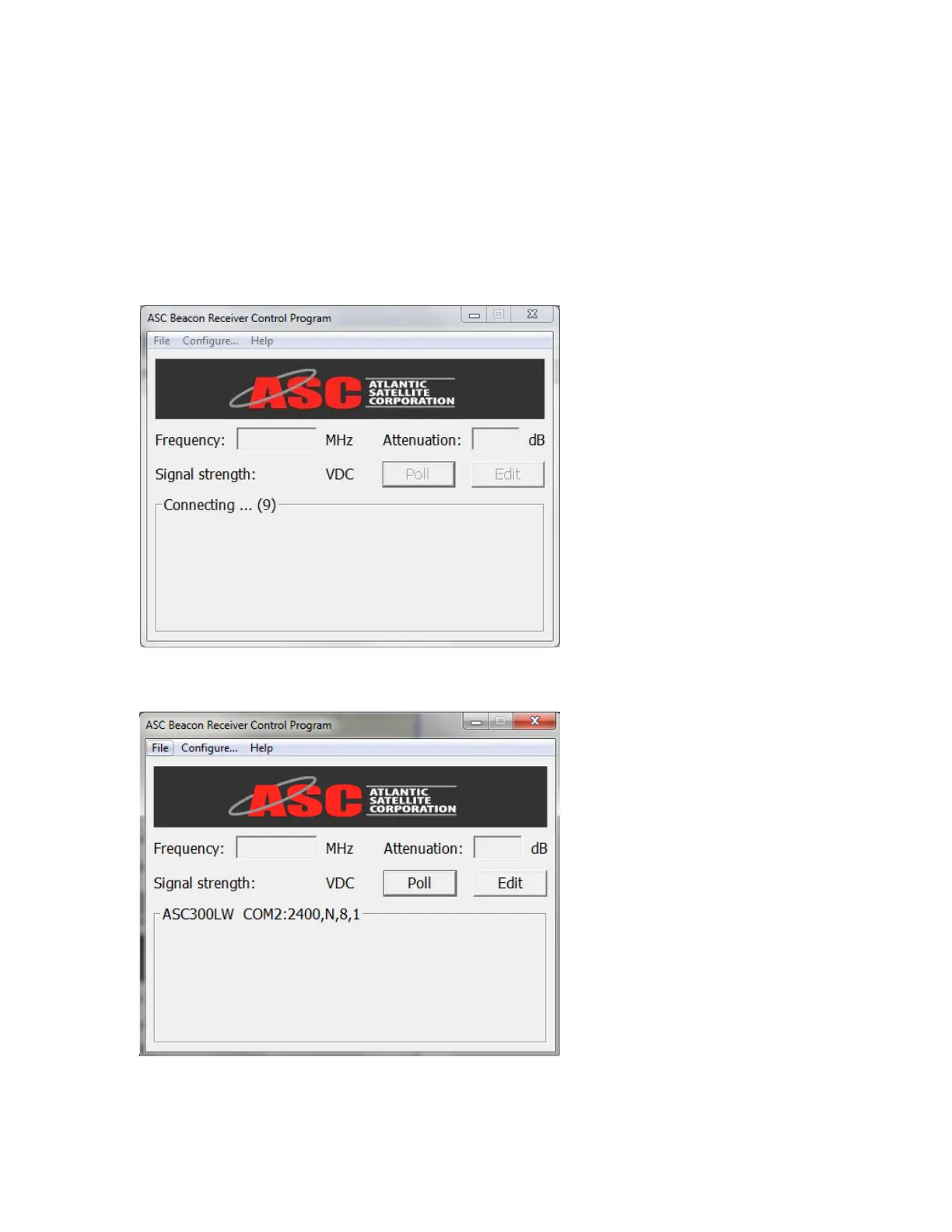 ASC300 series beacon receiver baud rates should be set to 2400. Set the connection to