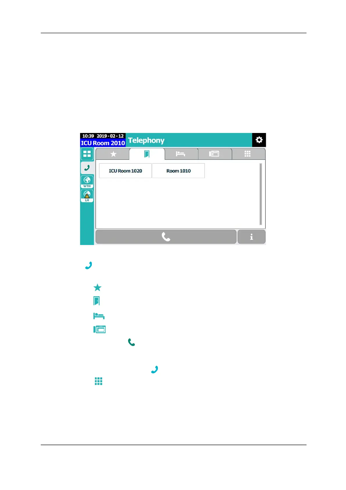 To call a favorite, room, bed, or staff console from the Telephony screen: