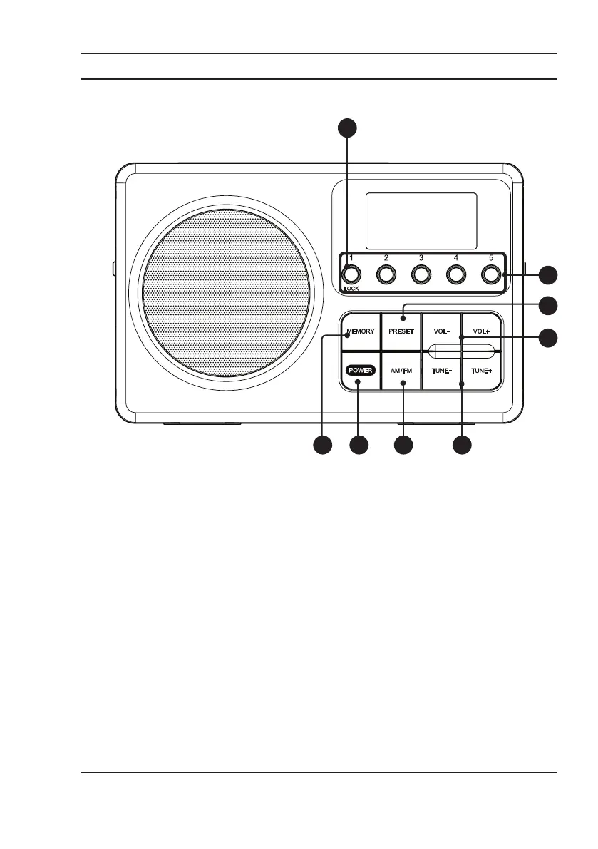 8. Lock: Press and hold to lock controls on radio.
