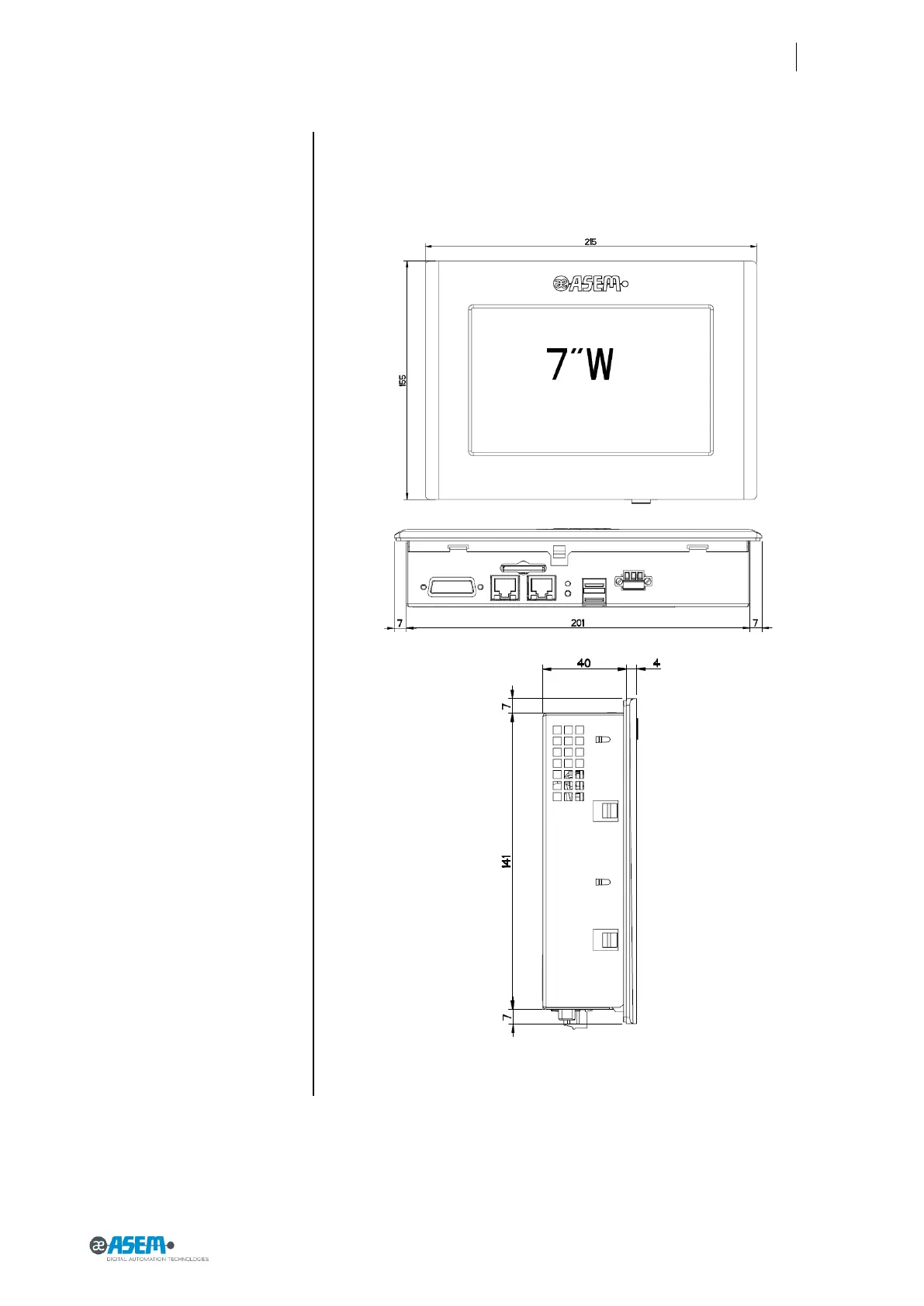 ASEM HMI30 - HMI30-TF 7.0 (Wide Aluminium Front Panel with True Flat Technology); Figure 88 HMI-TF30 7.0 Front View; Figure 89 HMI30-TF 7.0 Bottom View; Figure 90 HMI30-TF 7.0 Side View
