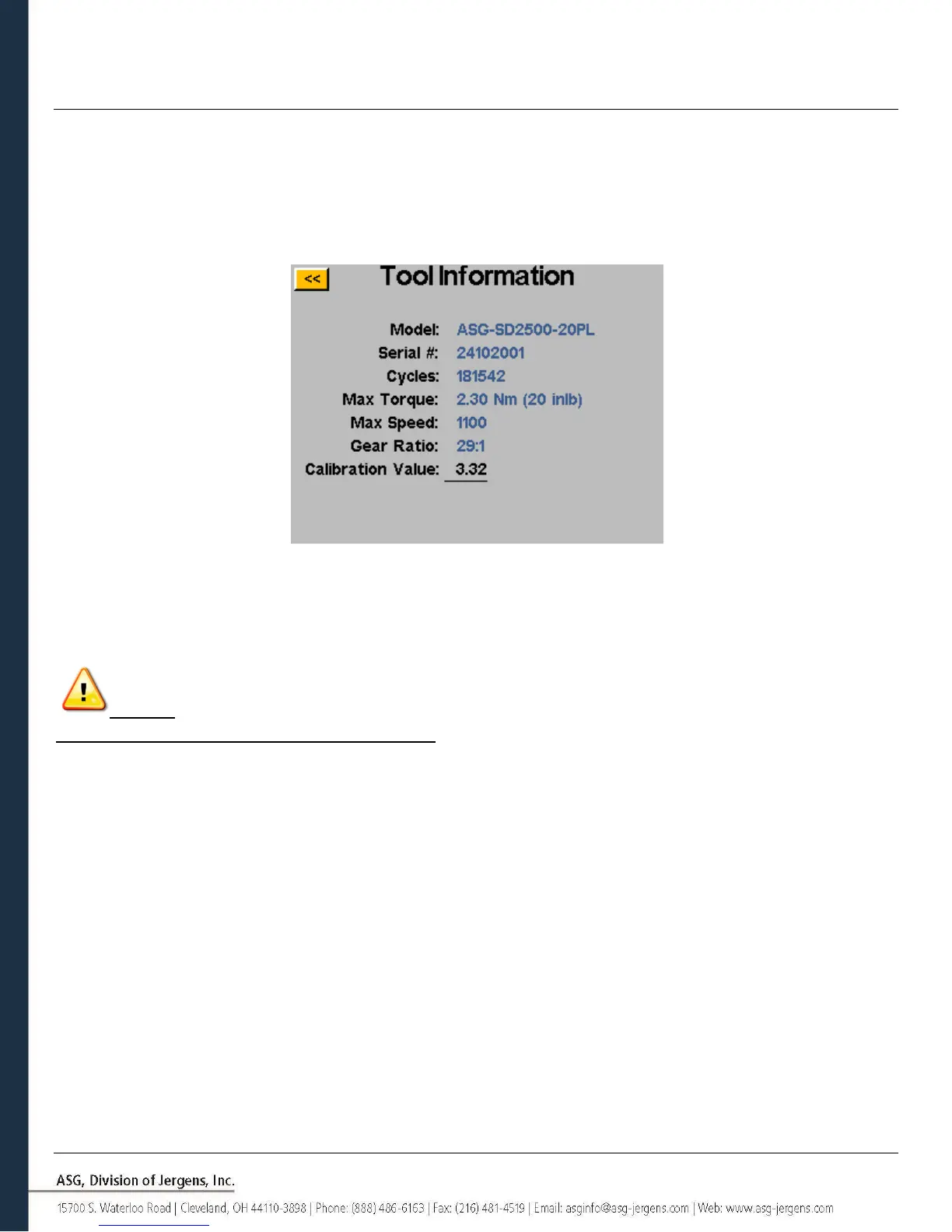 This screen displays characteristics of the tool that is currently attached to the ASG-CT2500 controller such as: