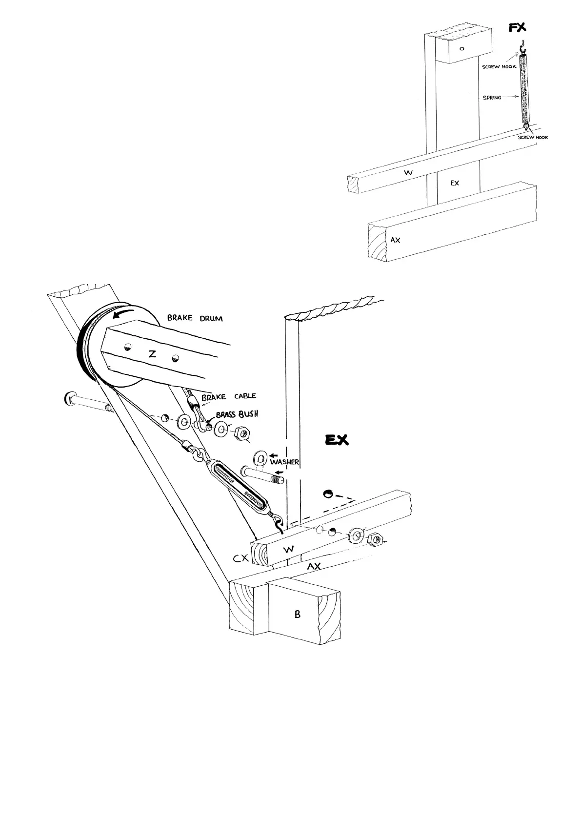 21. Locate the spring between the screw hooks in FX and brake lever W. Adjust the turnbuckle until the cable grips the brake