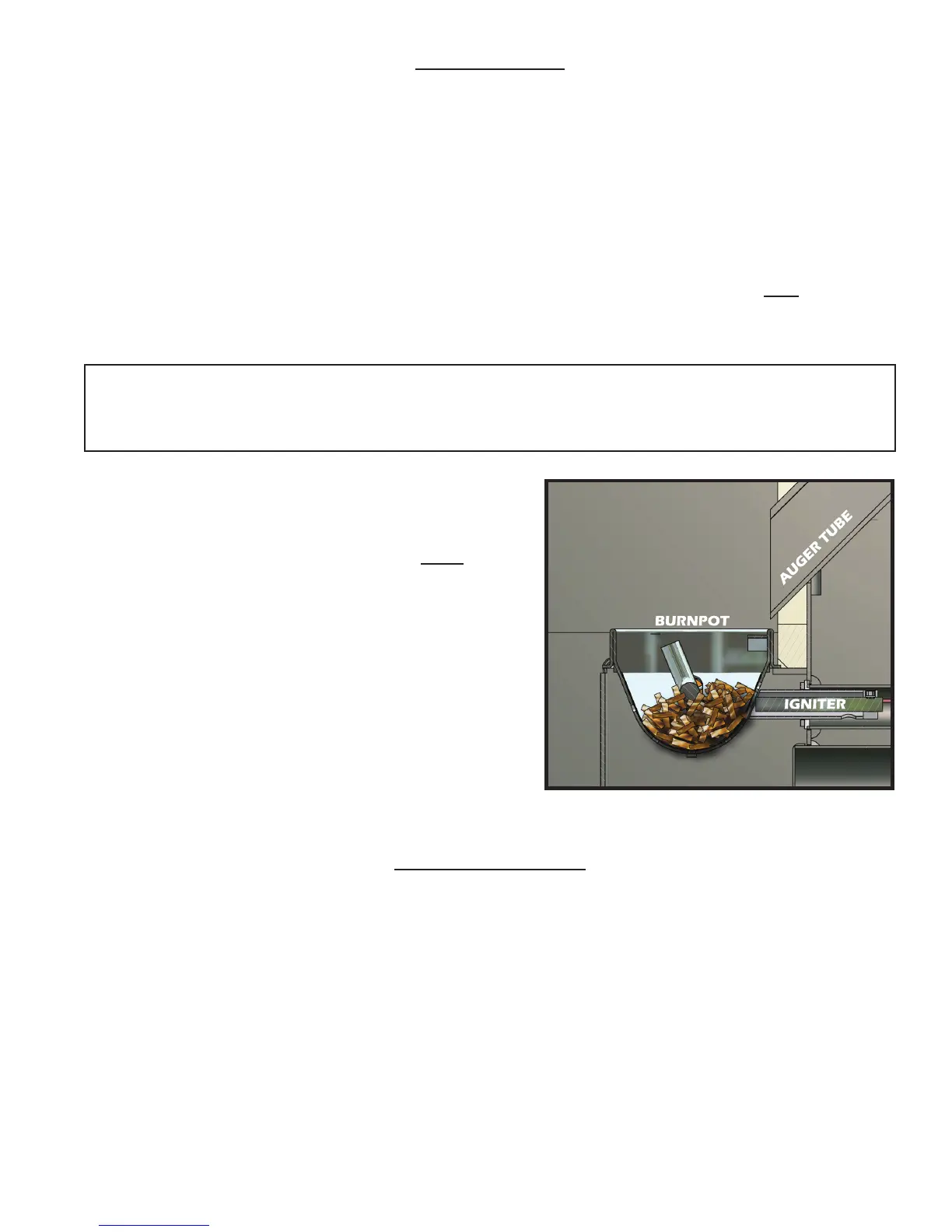 the burnpot, up to the igniter level as shown in the illustration below for auto ignition. Close the door and press the “ON” button. The