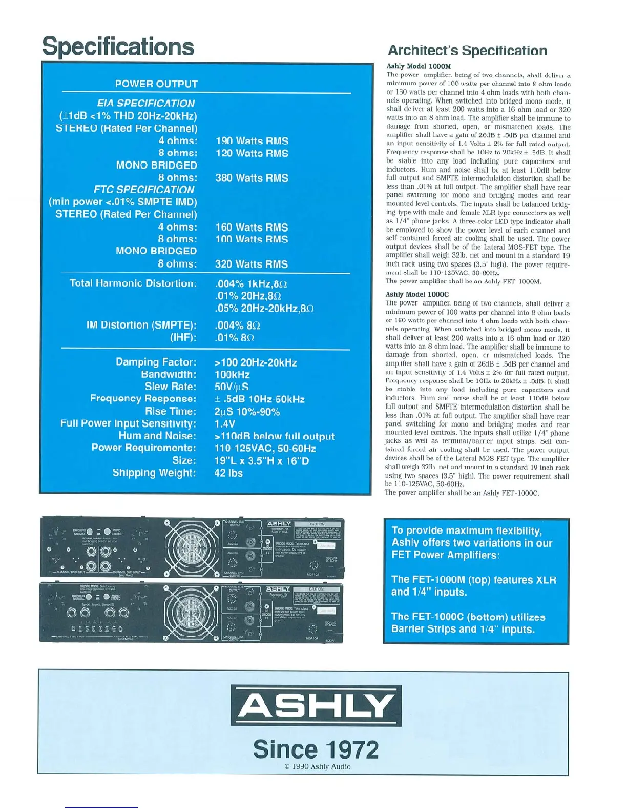 Ashly FET-1000C - Technical Specifications; Power Output Ratings; Distortion and Noise Levels; Input Sensitivity and Power Requirements
