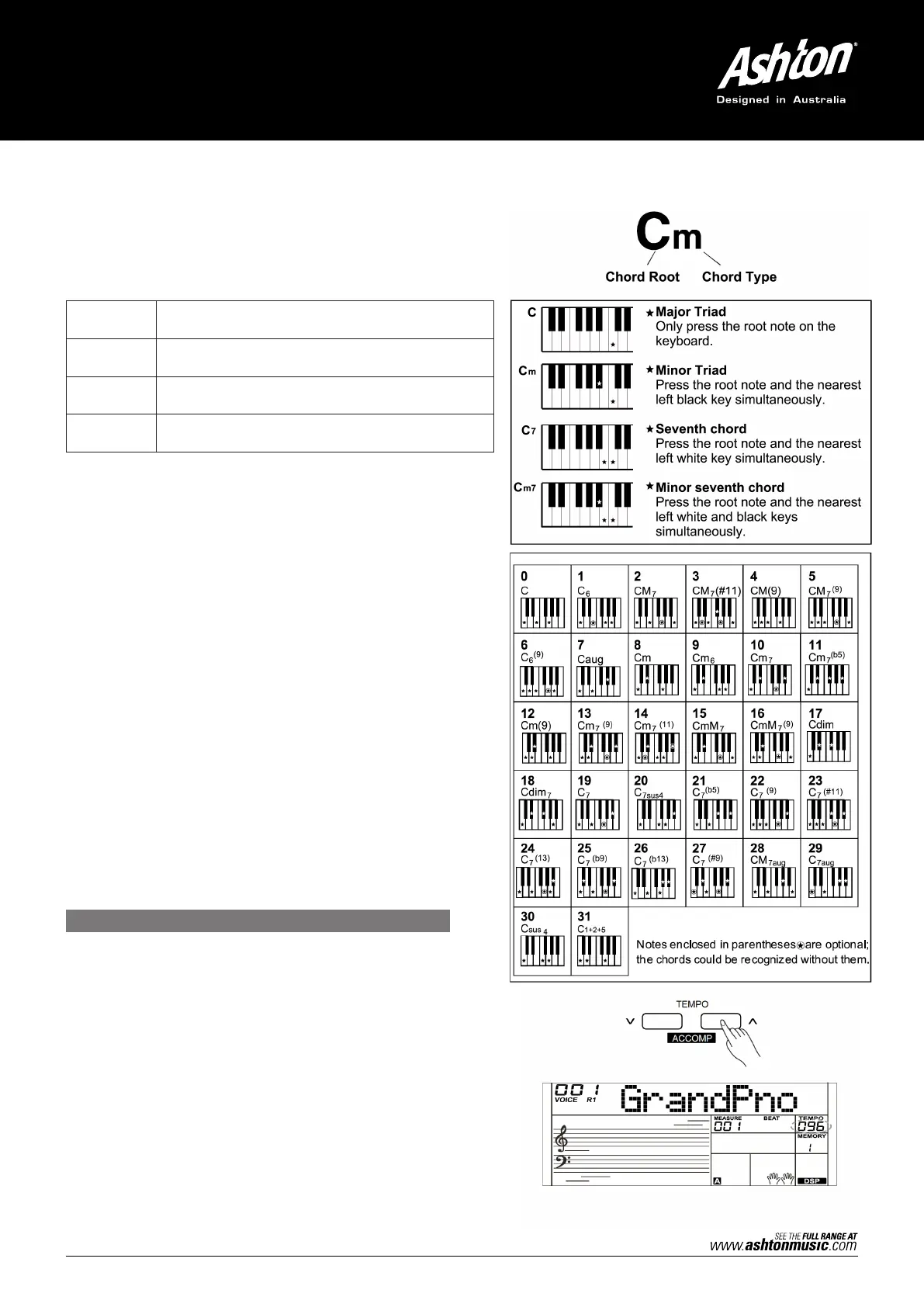 playing the 32 chord types in C scale as listed on the right.