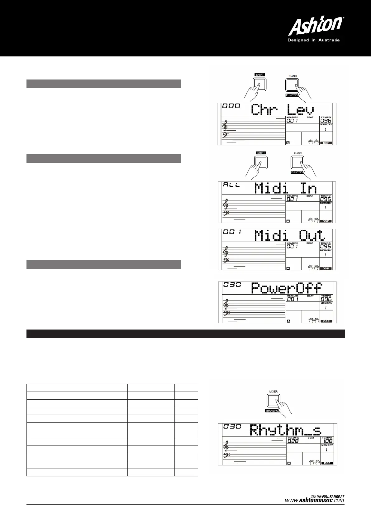 1. Press the [MIXER] button to enter the Mixer Function menu. The LCD will display “030 Rhythm_s” initially when powered on;