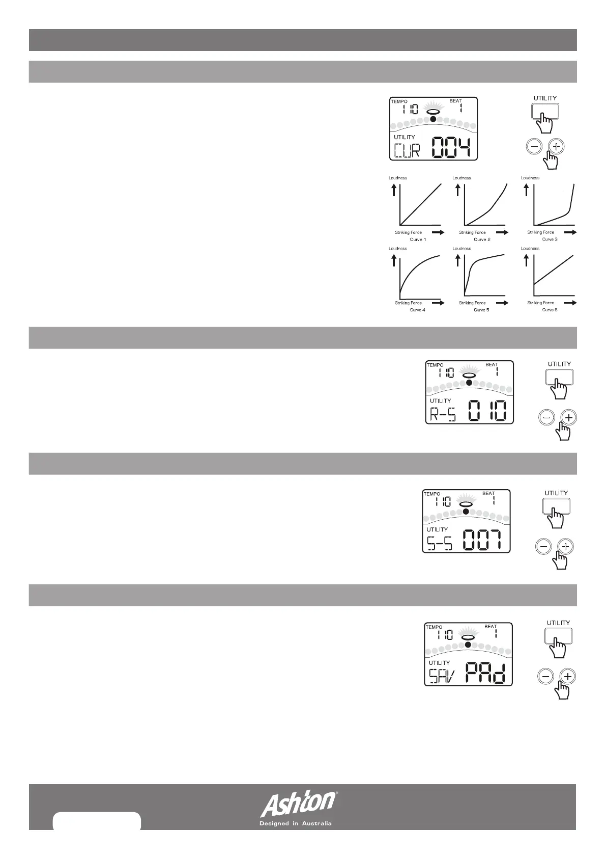 Press the [PAGE] or [UTILITY] button, select Pad Curve page. The display will show: