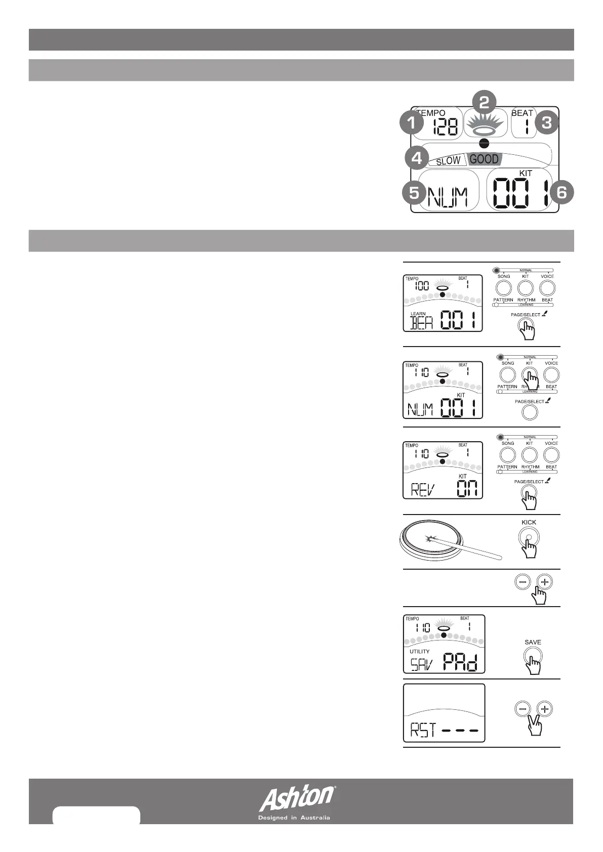 Hit the pad or press the Pad button such as [KICK], [SNARE], [RIM], etc.
