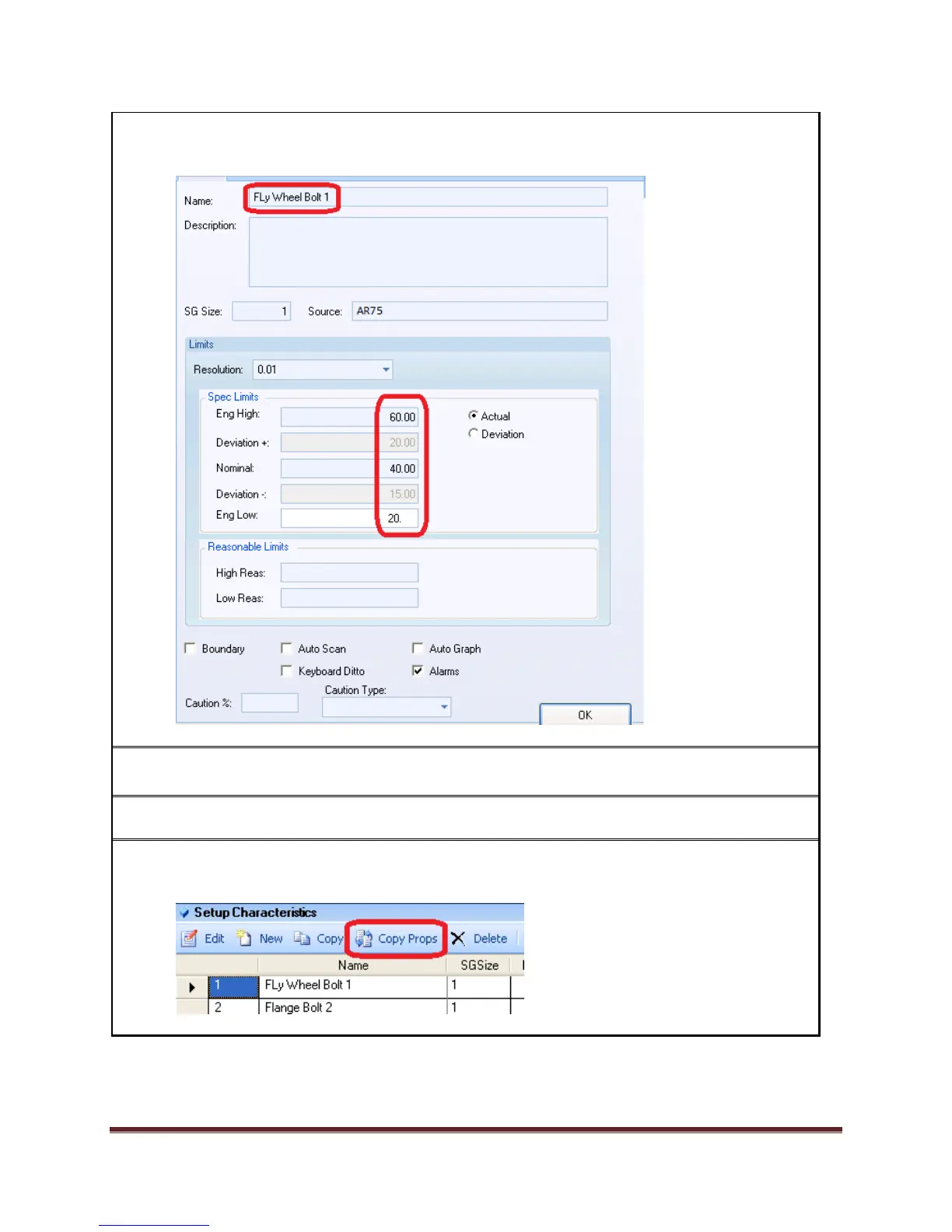 19. Edit Flange Bolt 1 and rename it to Fly Wheel Bolt 1. Change the spec limits as shown and