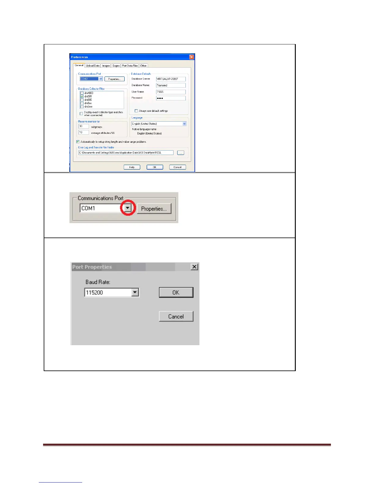 9) To configure communications, select the serial port to which the data collector is