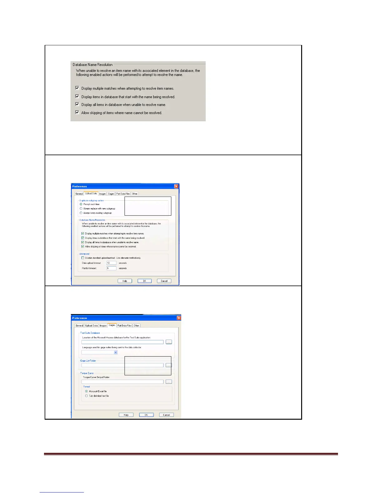 Note: deselecting options (removing check marks) disables Database Name