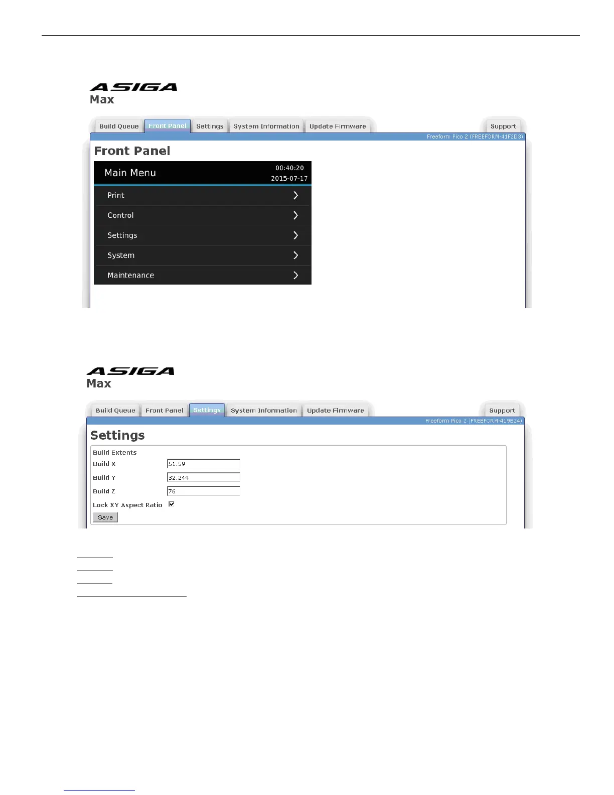 The Settings tab is used to define the physical build extents of the MAX machine.