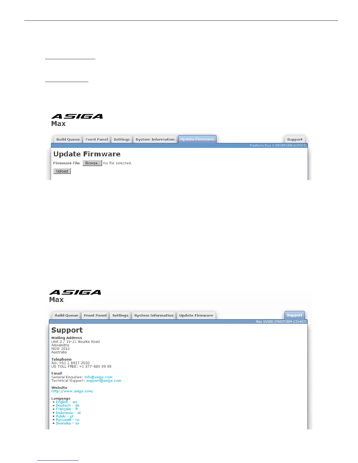 The Support tab provides contact details for obtaining support from Asiga for the printer