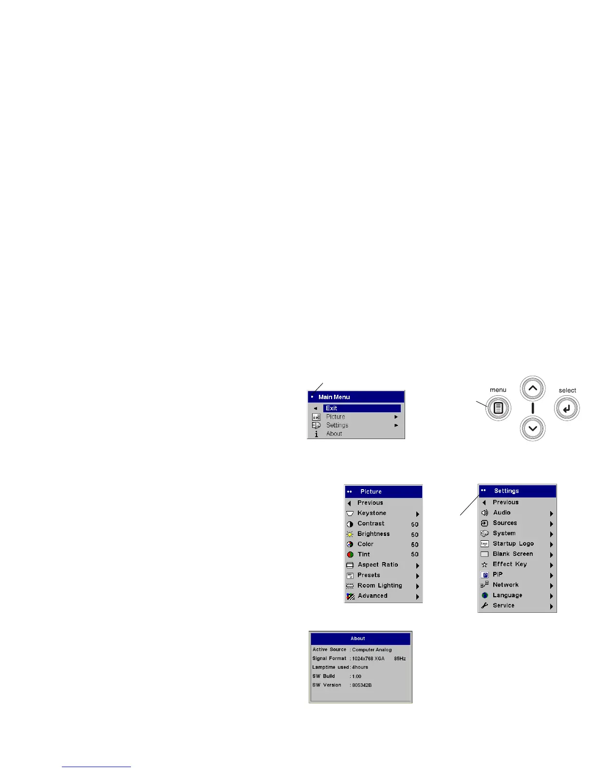 • Меню Настройки предоставляет возможность выполнения регулировок