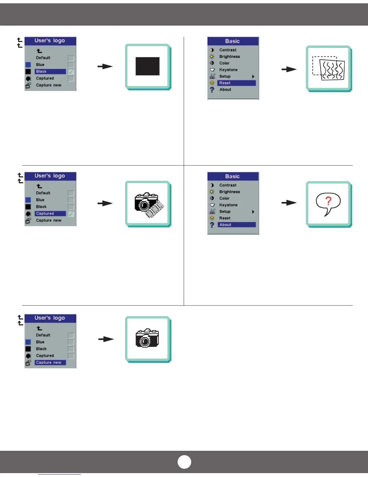 Projects the user defined logo screen when no source is connected. Ref Chap. H