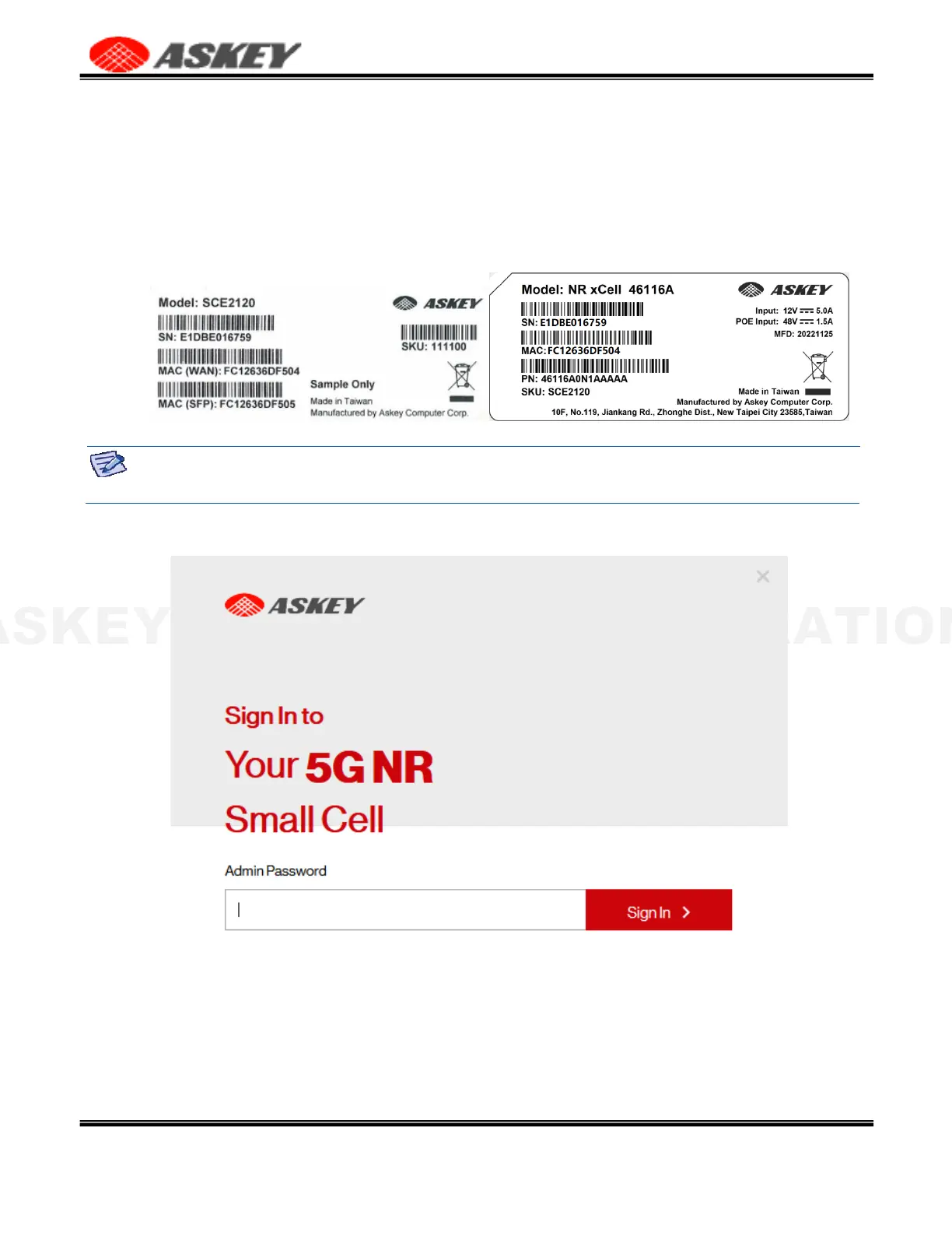 Figure 13. The Askey 5G NR Small Cell Admin Website Sign-In Form