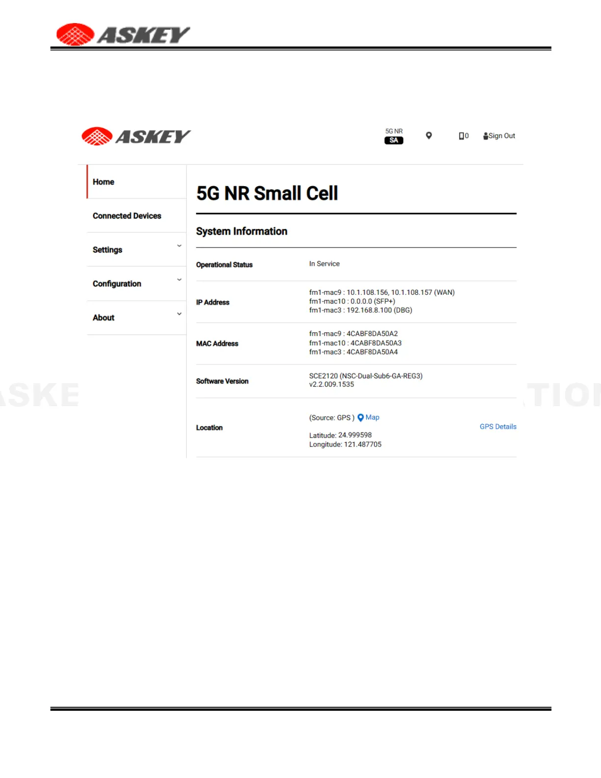 Figure 14. The Askey 5G NR Small Cell Admin Website Overview