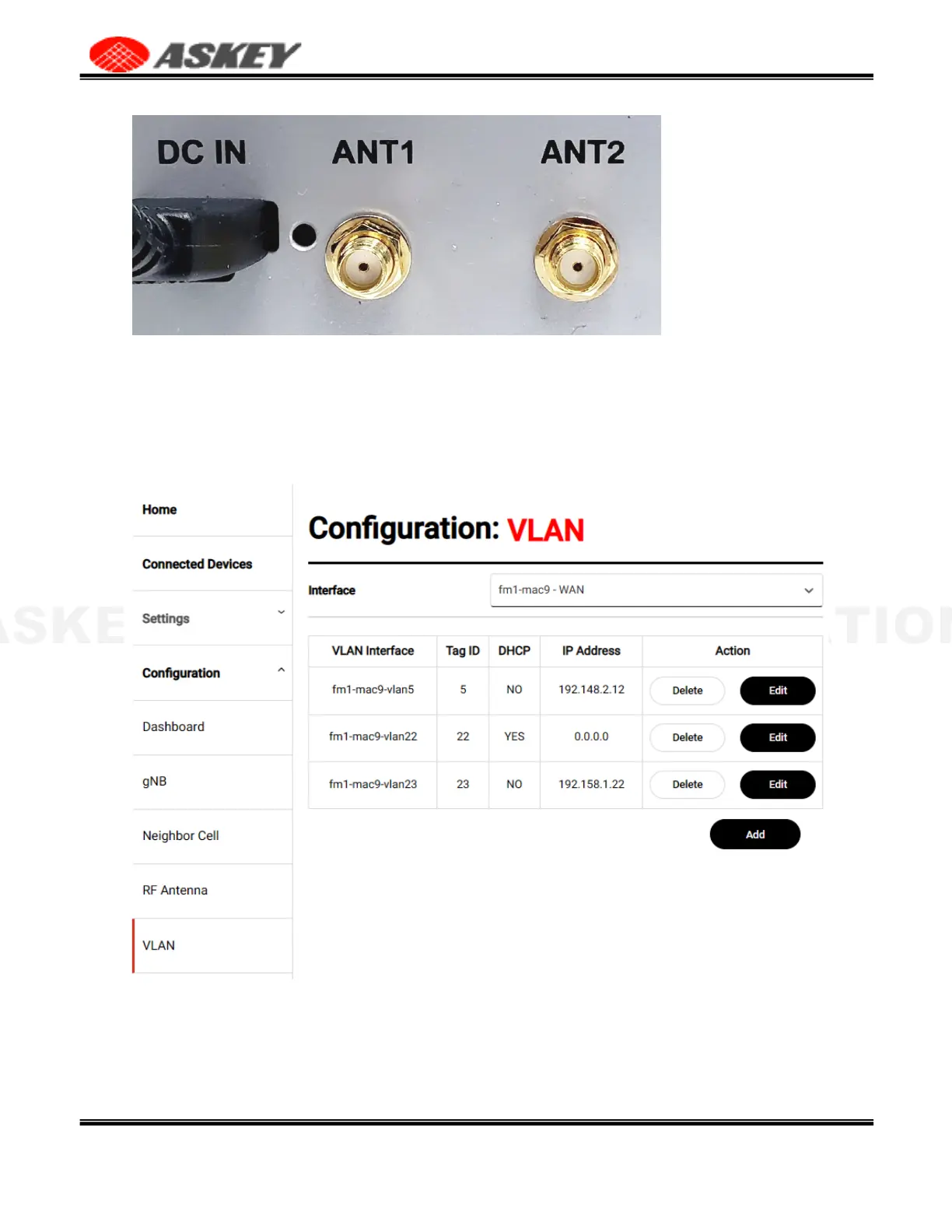 This Askey 5G NR Small Cell VLAN page allows users to create, read, update and delete the VLAN (Virtual