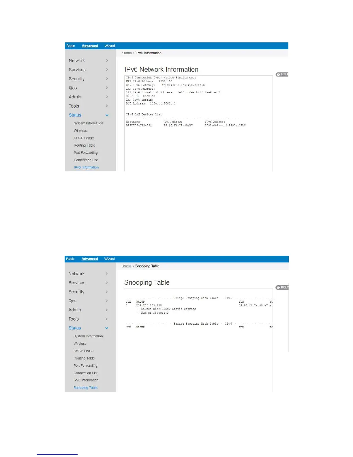 From the navigation panel, go to Advanced > Status > Snooping Table.