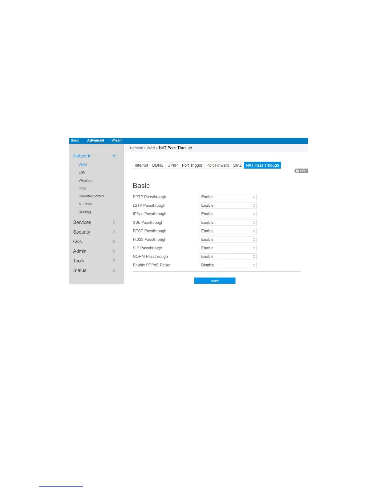 1. To configure NAT Pass Through settings, go to Advanced > Network > WAN >