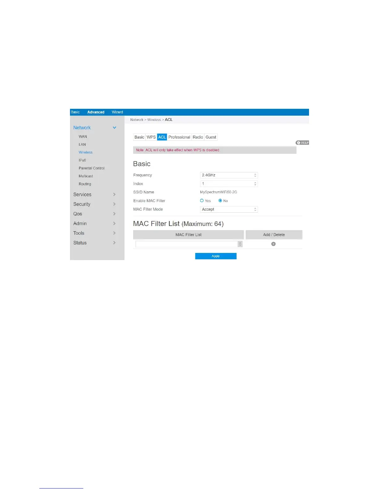6. MAC Filter Mode: Select Accept to allow devices in the MAC filter list to