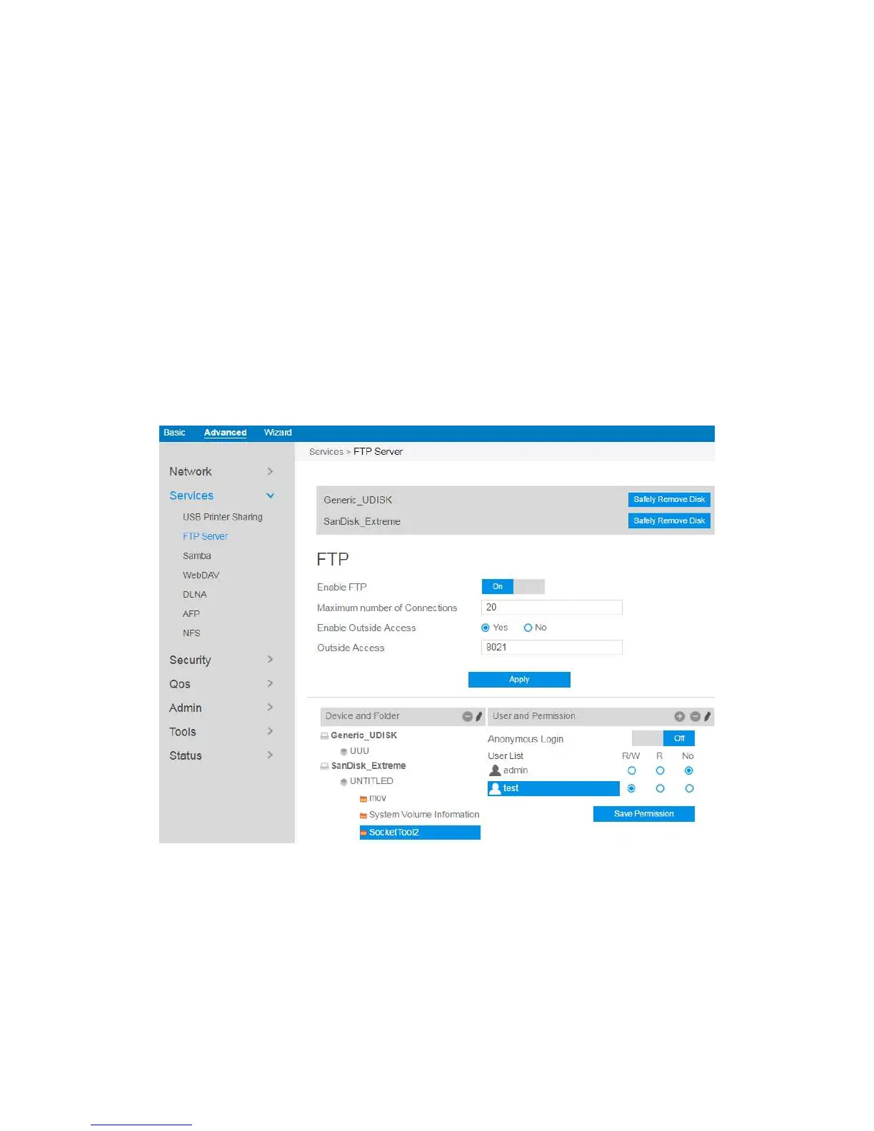 9. From the navigation panel, go to Advanced > Services > FTP Server.