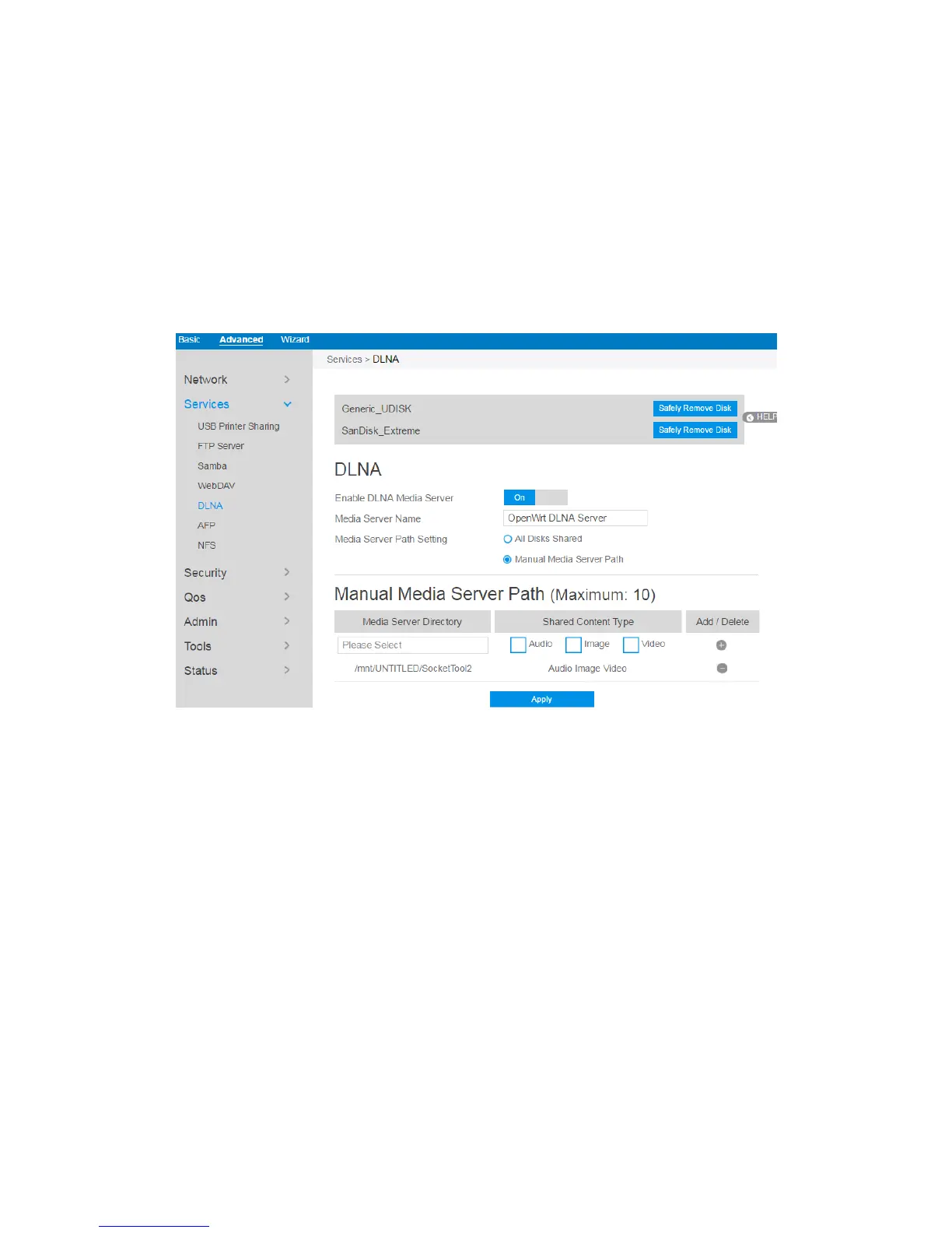 1. From the navigation panel, go to Advanced > Services > DLNA Server.