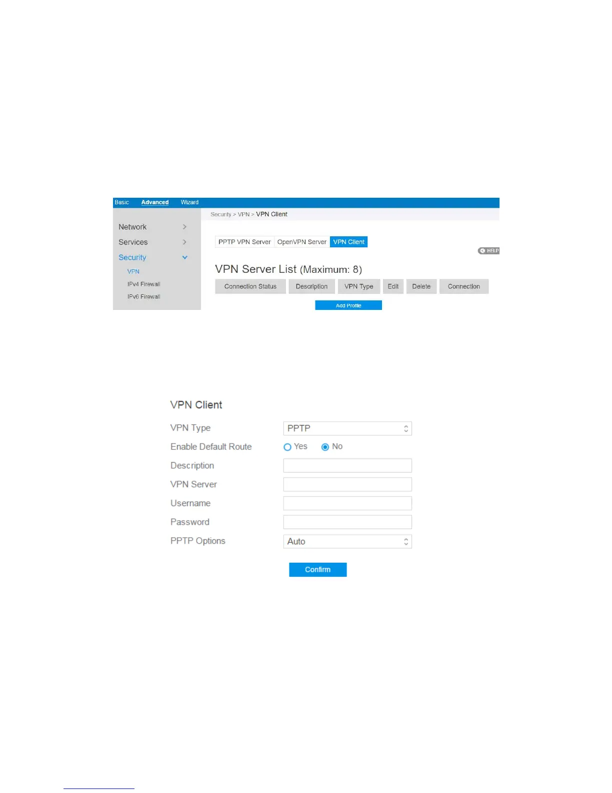 2. VPN Sever list is displayed. Click Add Profile to set up VPN Client.