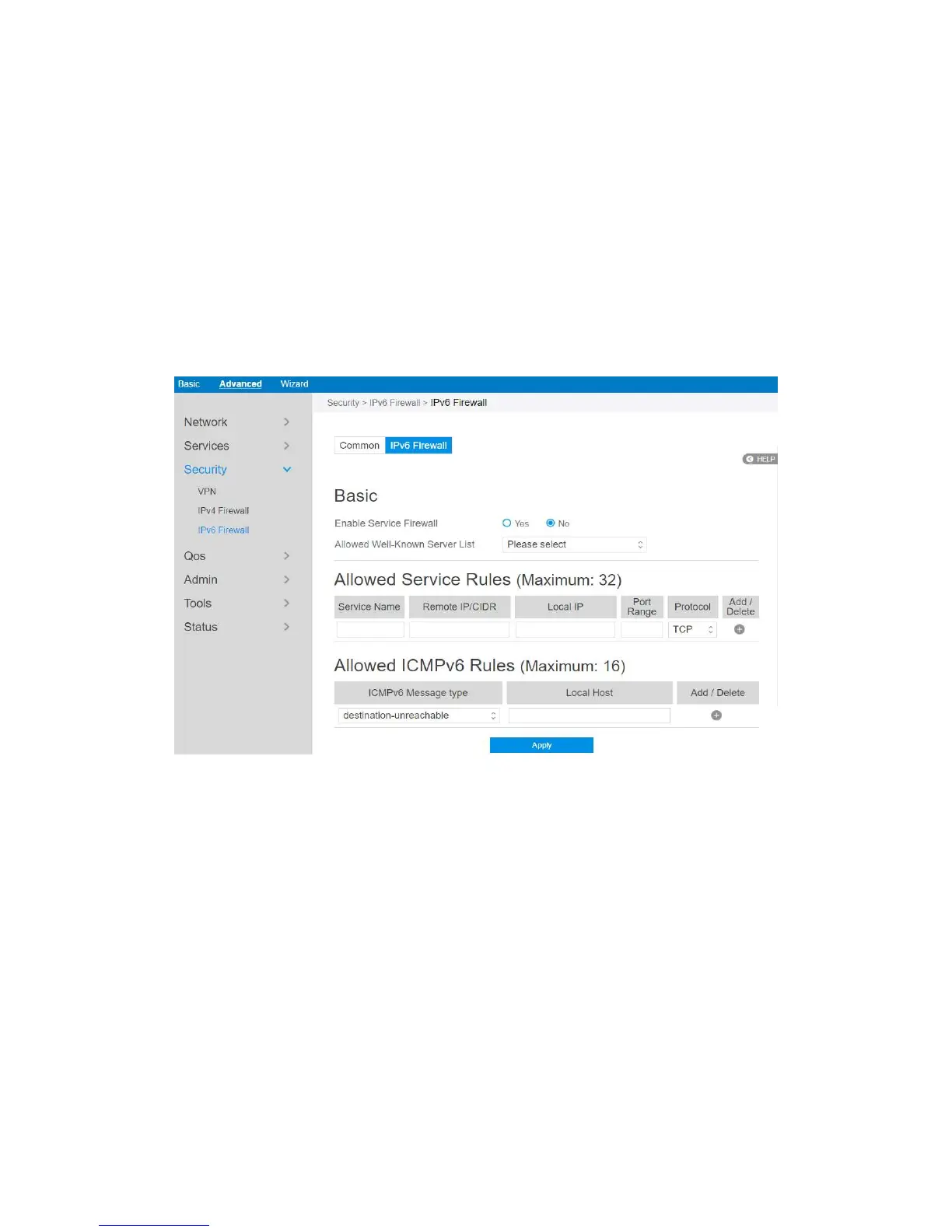 2. Enable Service Firewall: Enable or disable the IPv6 firewall. When disabled, all