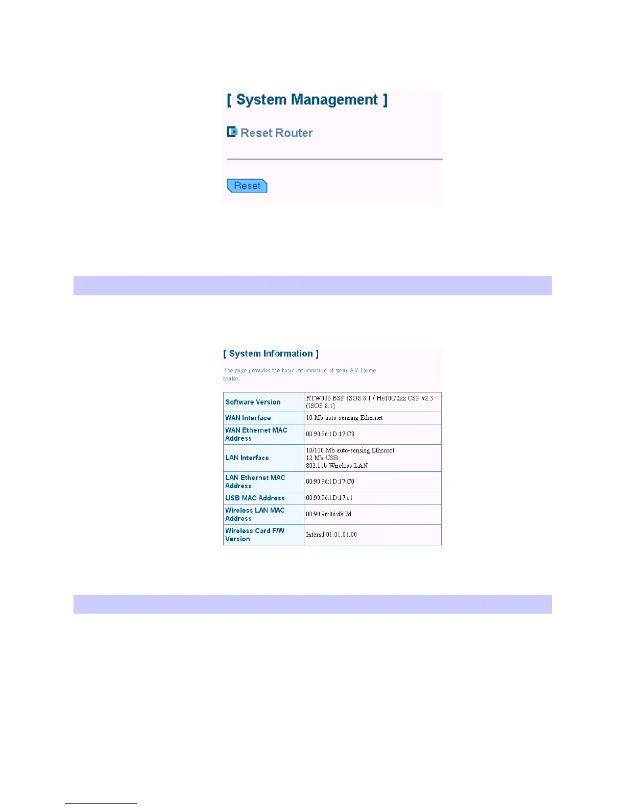 software version, WAN MAC address, LAN MAC address, Wireless LAN MAC address etc.