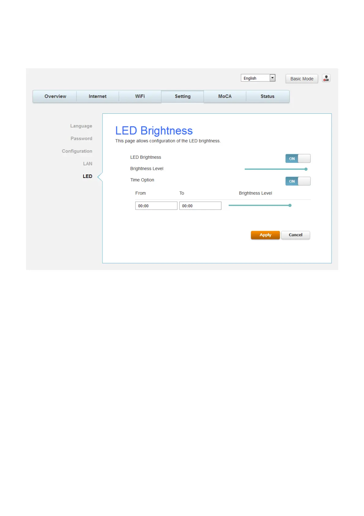 This page allows configuration of the LED brightness.
