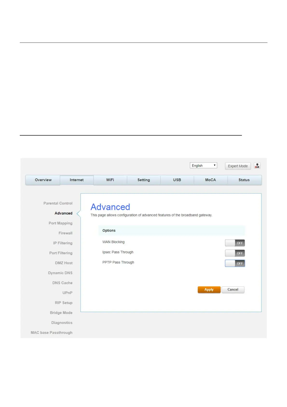 This page allows you to configuration of advanced features of the broadband Gateway.