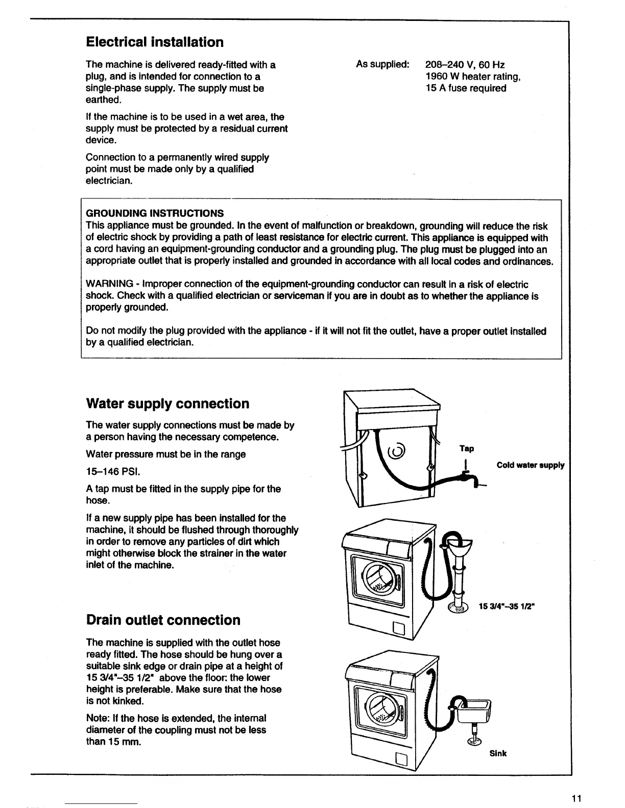 Asko 10505 - Electrical Installation; Grounding Instructions; Water & Drain Connections; Water Supply Connection