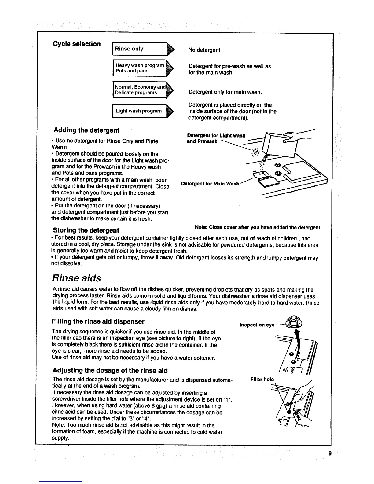 Asko 1502 - Rinse Aids; Cycle Selection; Adding the Detergent; Storing the Detergent