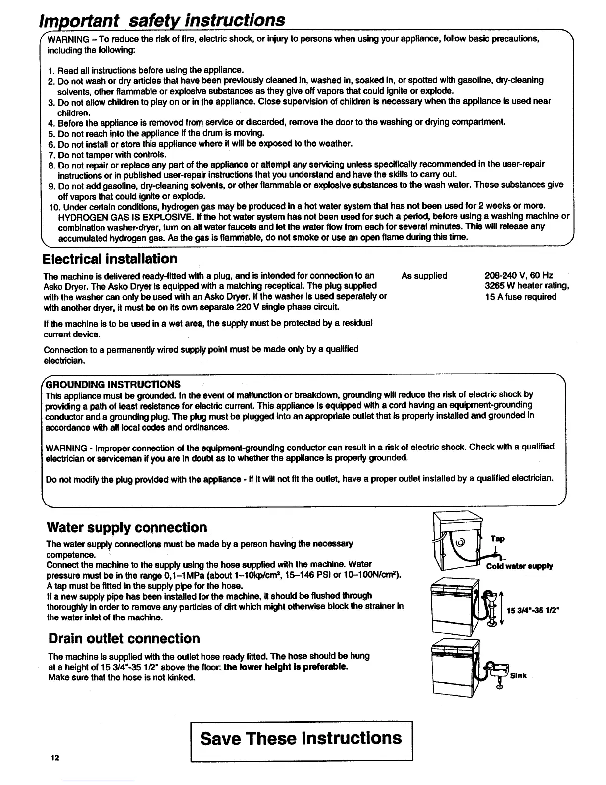 Asko 20605 - Important Safety and Connection Procedures; General Safety Precautions; Electrical and Water Connections