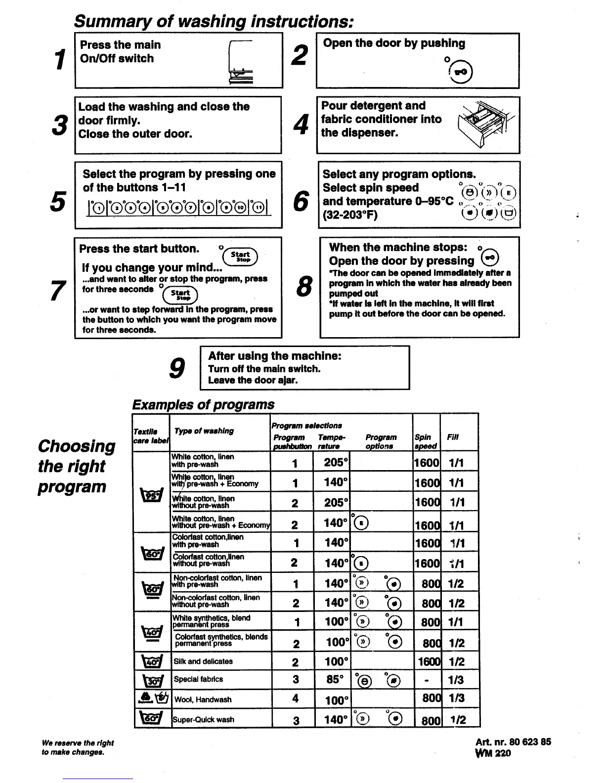 Asko 20605 - Summary of Washing Instructions; Choosing the Right Program