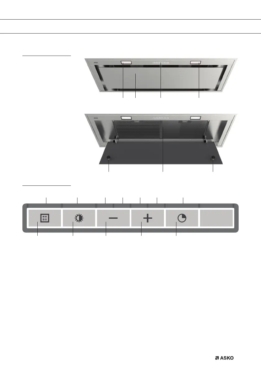 10. Speed down button, reduces air extraction capacity and switches off