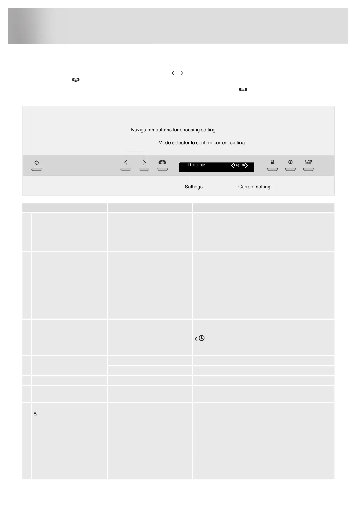 To open the dishwasher's Settings menu, press the Navigation button or until Settings menu is shown on the display and confirm your selection