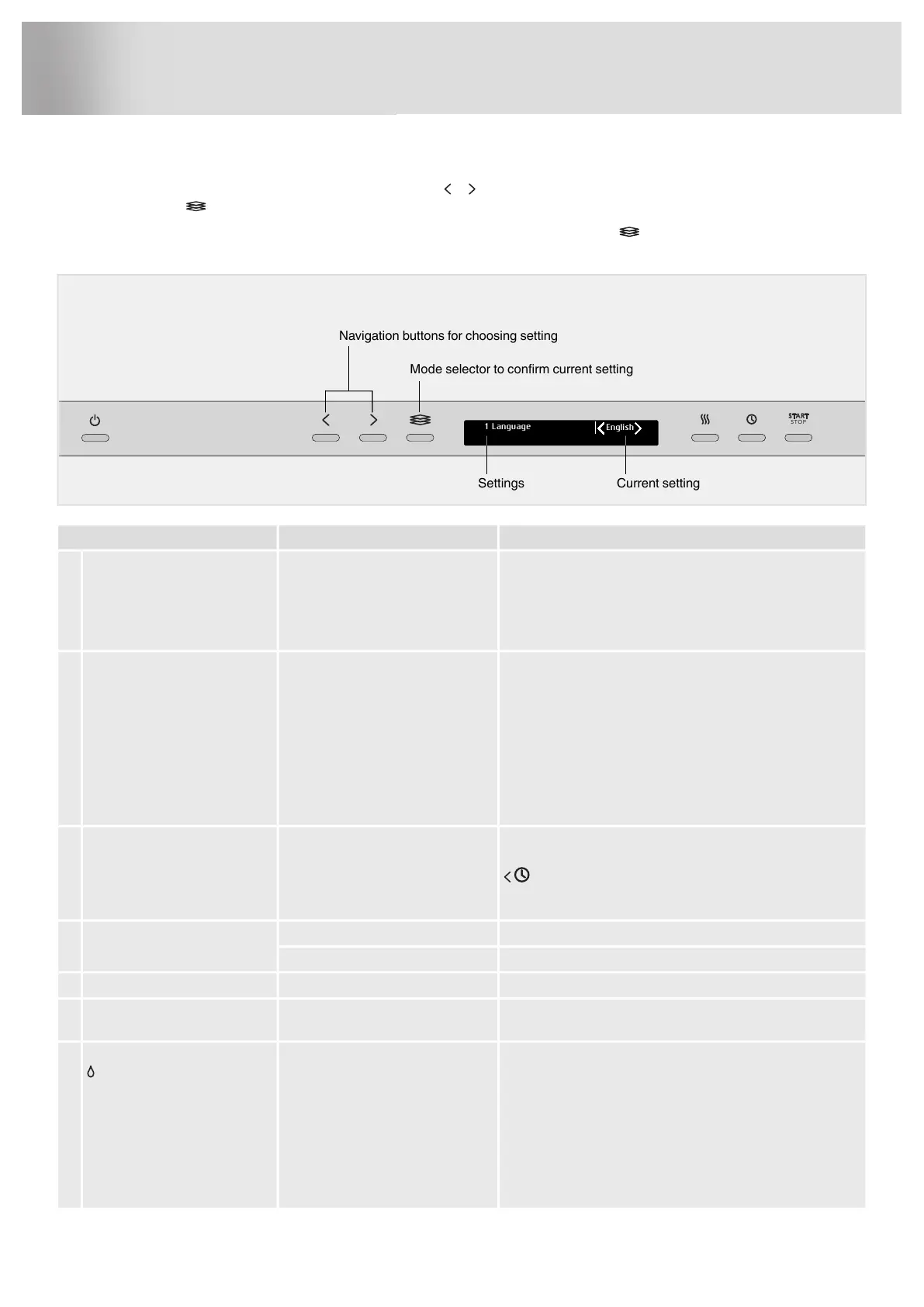 To open the dishwasher's Settings menu, press the Navigation button or until Settings menu is shown on the display and confirm your selection