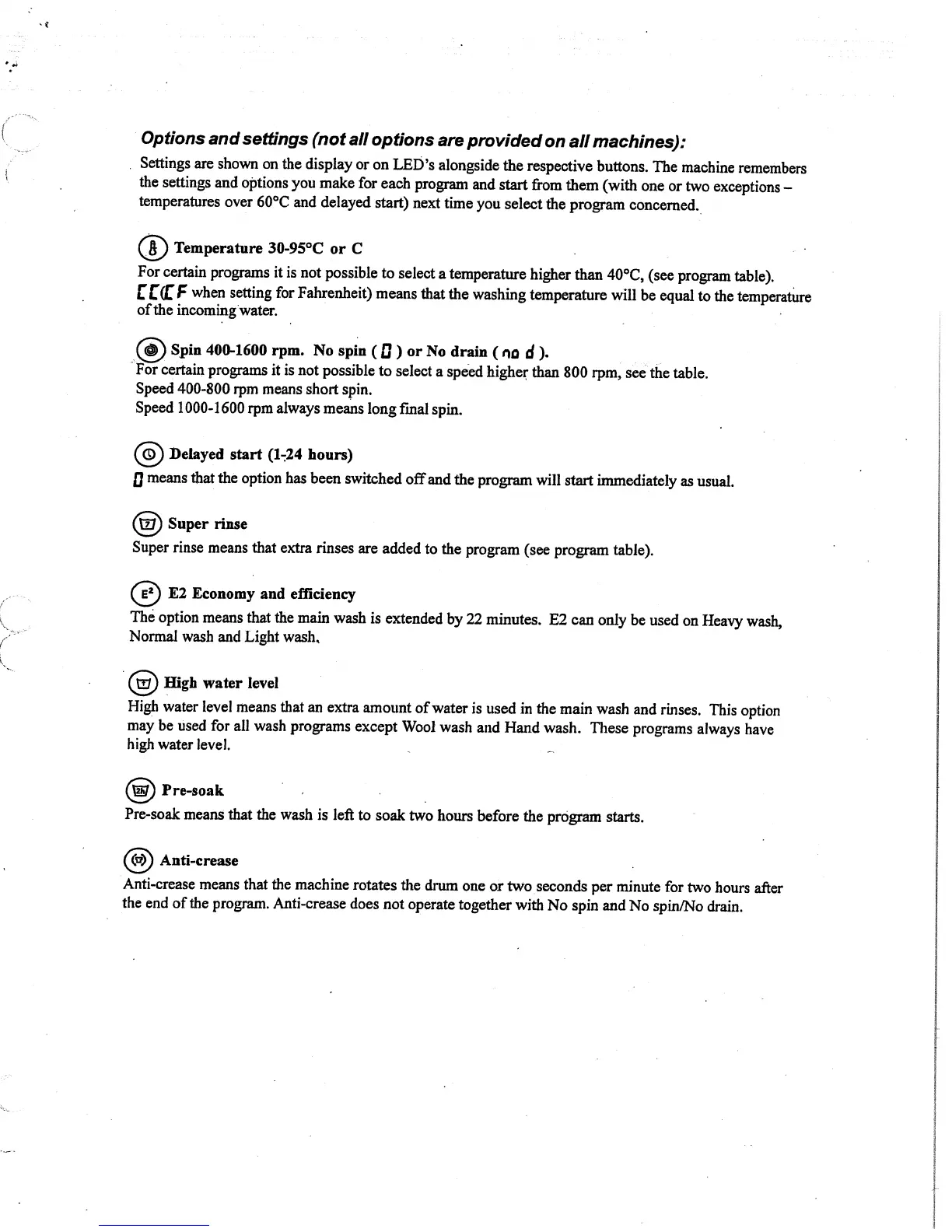 Asko W6441 - Options and settings; Temperature 30-95°C or C; Spin 400-1600 rpm. No spin (0) or No drain (no d).; Delayed start (1-24 hours)