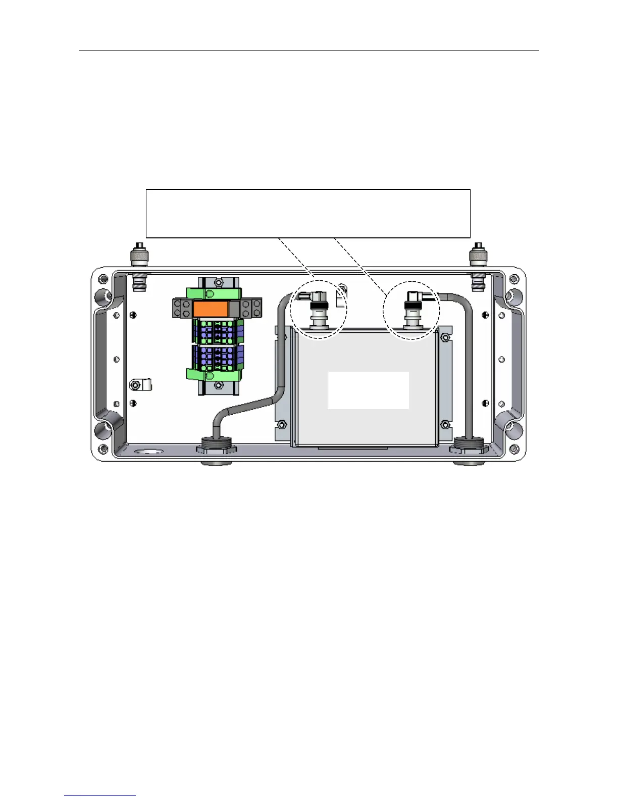 d. Feed the antenna cables through the cable glands or conduits, cut to length, and terminate to