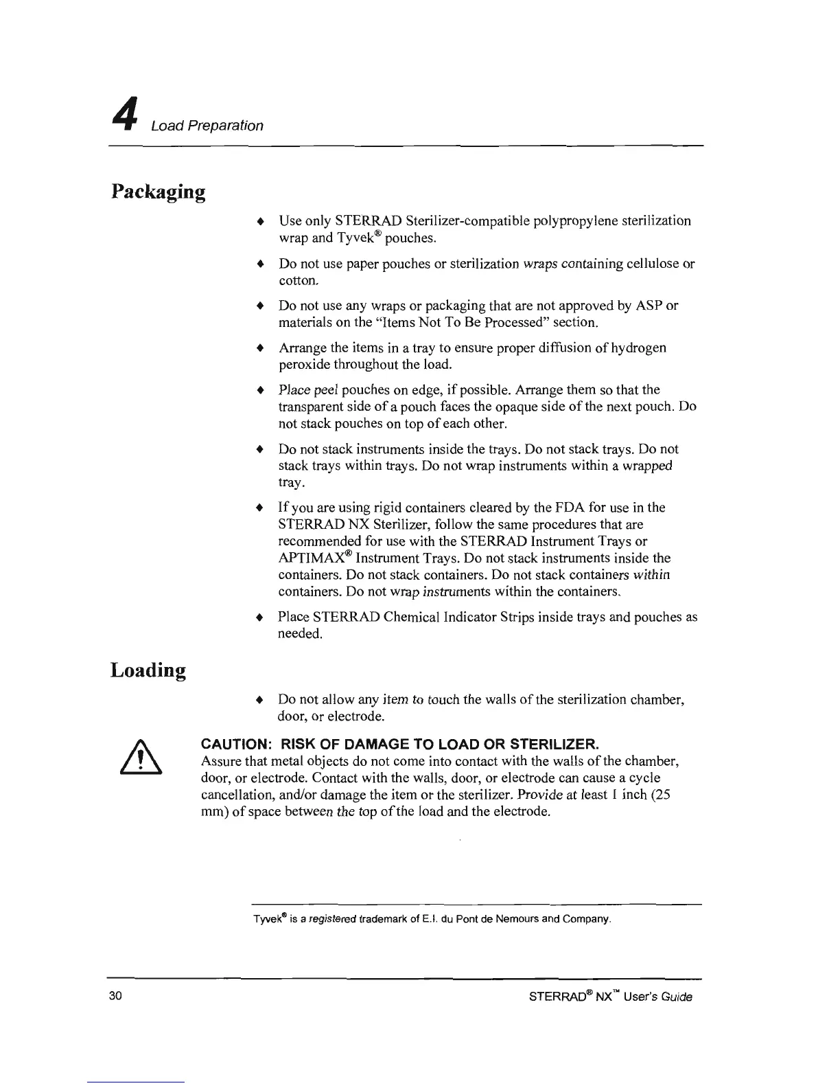 • Do not use paper pouches or sterilization wraps containing cellulose or