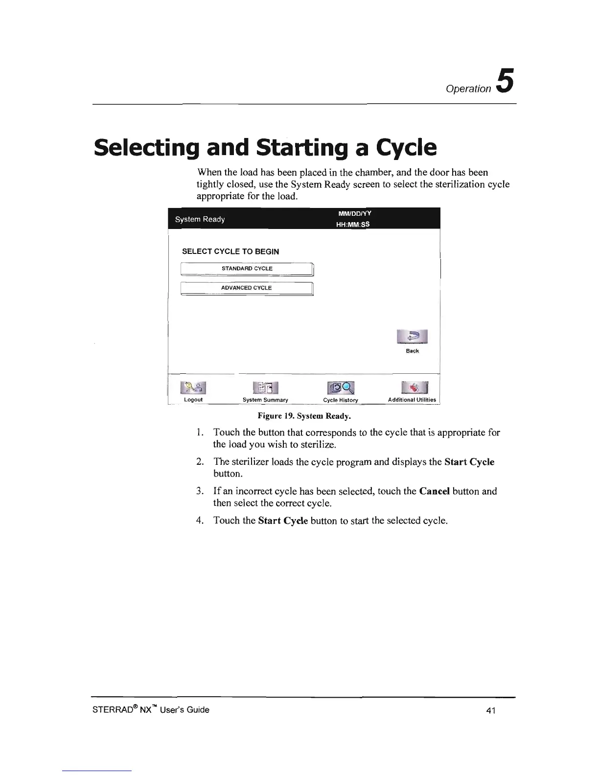 tightly closed, use the System Ready screen to select the sterilization cycle