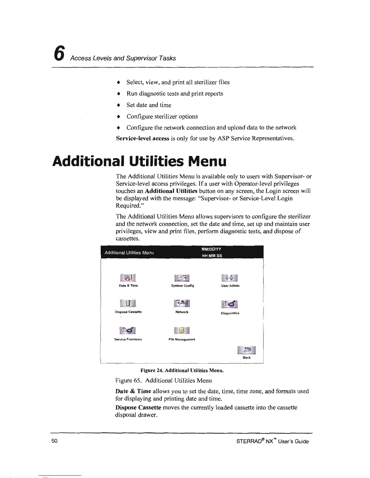 The Additional Utilities Menu allows supervisors to configure the sterilizer