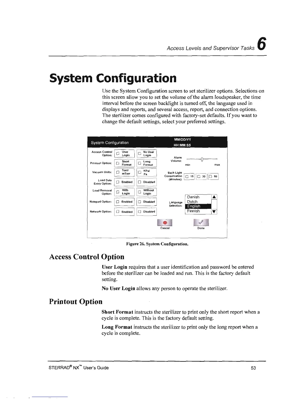 Use the System Configuration screen to set sterilizer options. Selections on