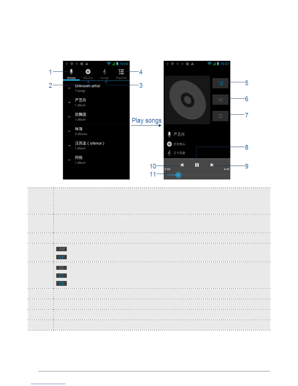 Displayed with songs’ name,hold one,you can play, add to a playlist,