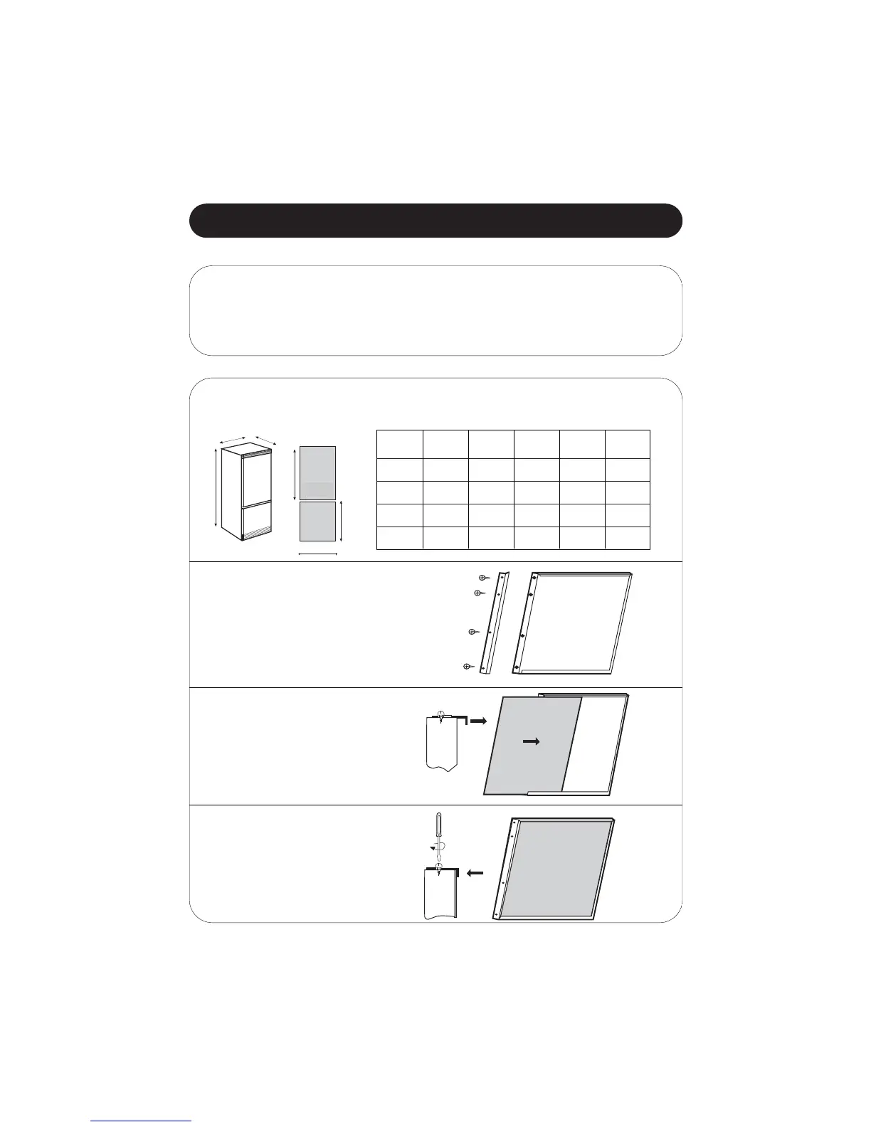 Abmessungen des paneelierbaren Kühlschranks und der Türpaneele.