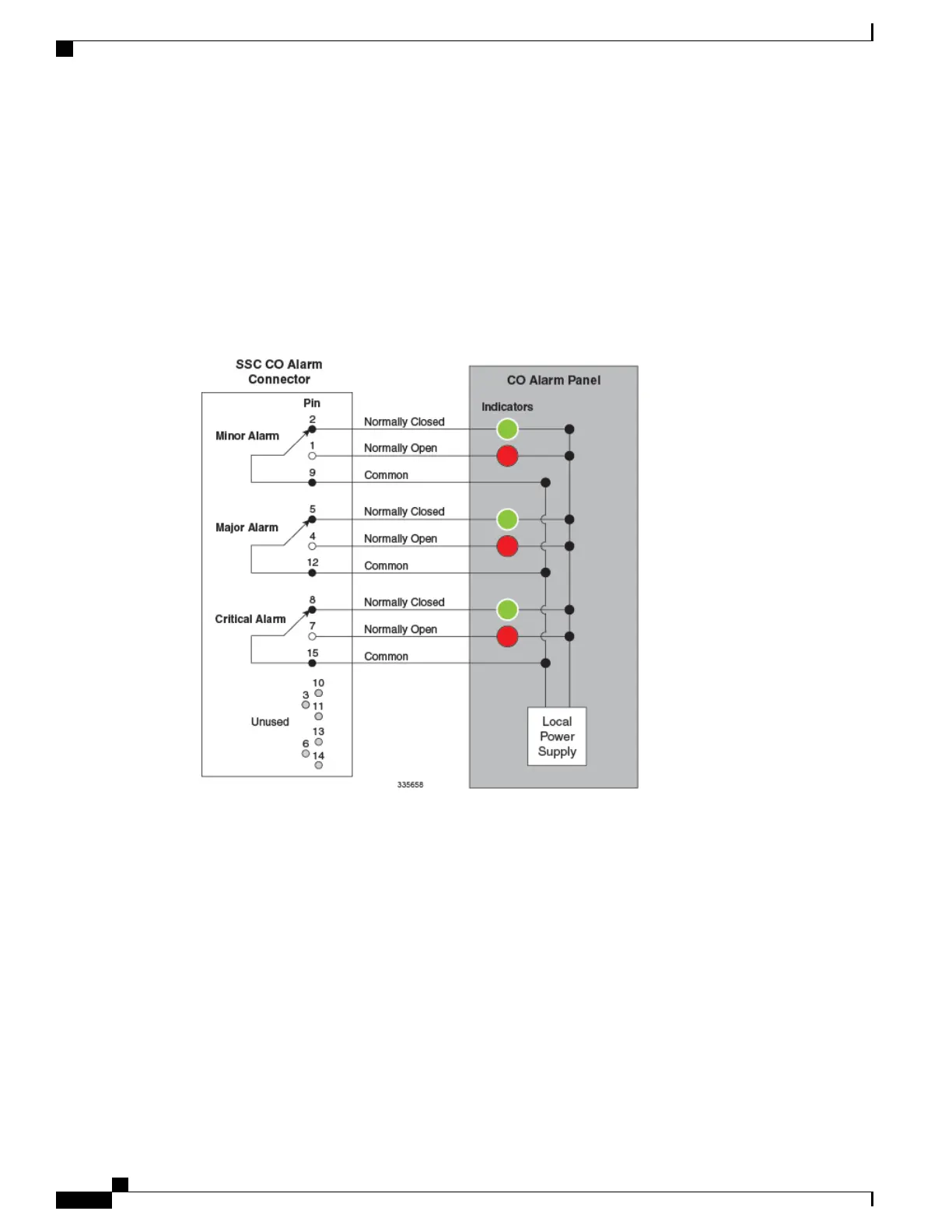 green LEDs are wired to indicate normal operation, and red LEDs are wired to indicate alarm conditions.