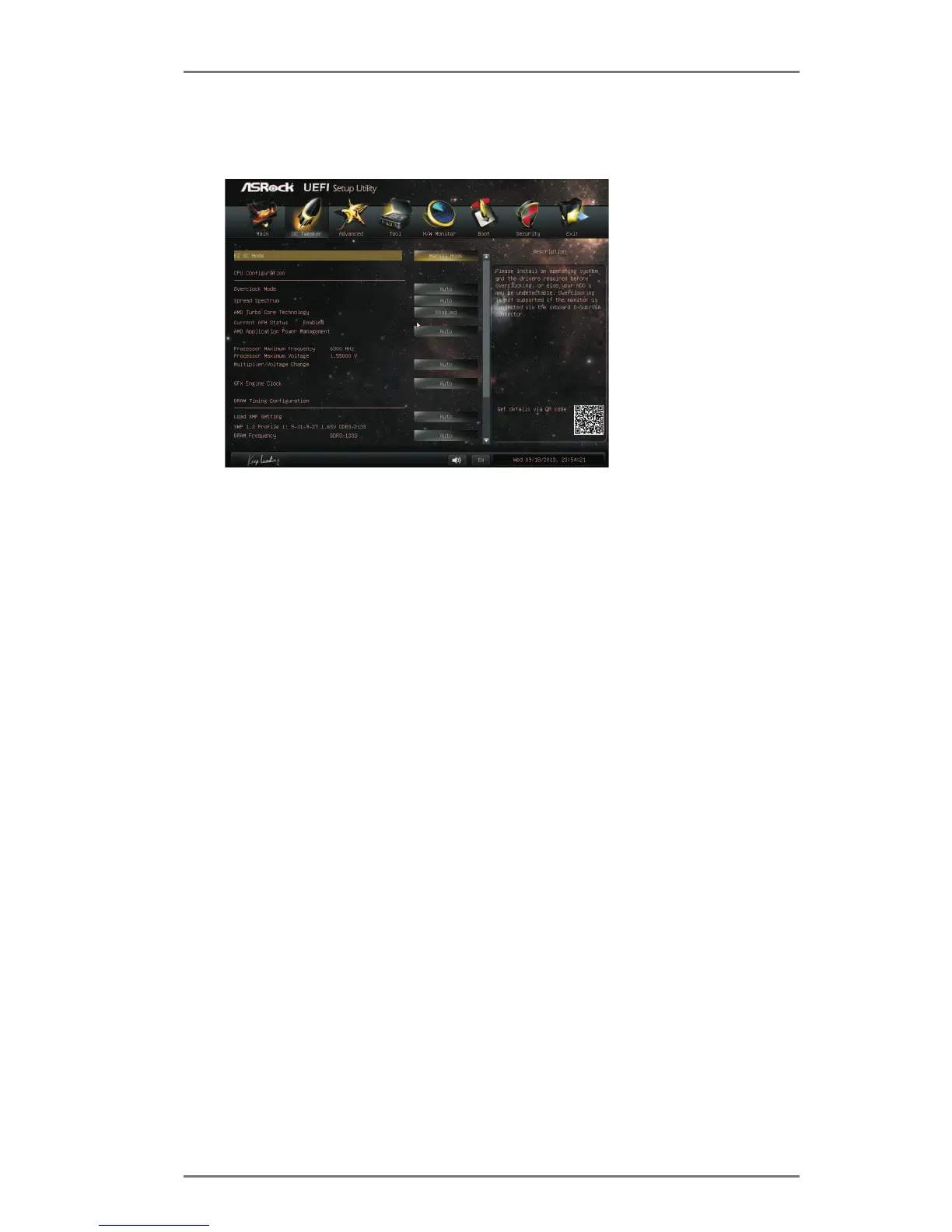 In the OC Tweaker screen, you can set up overclocking features.