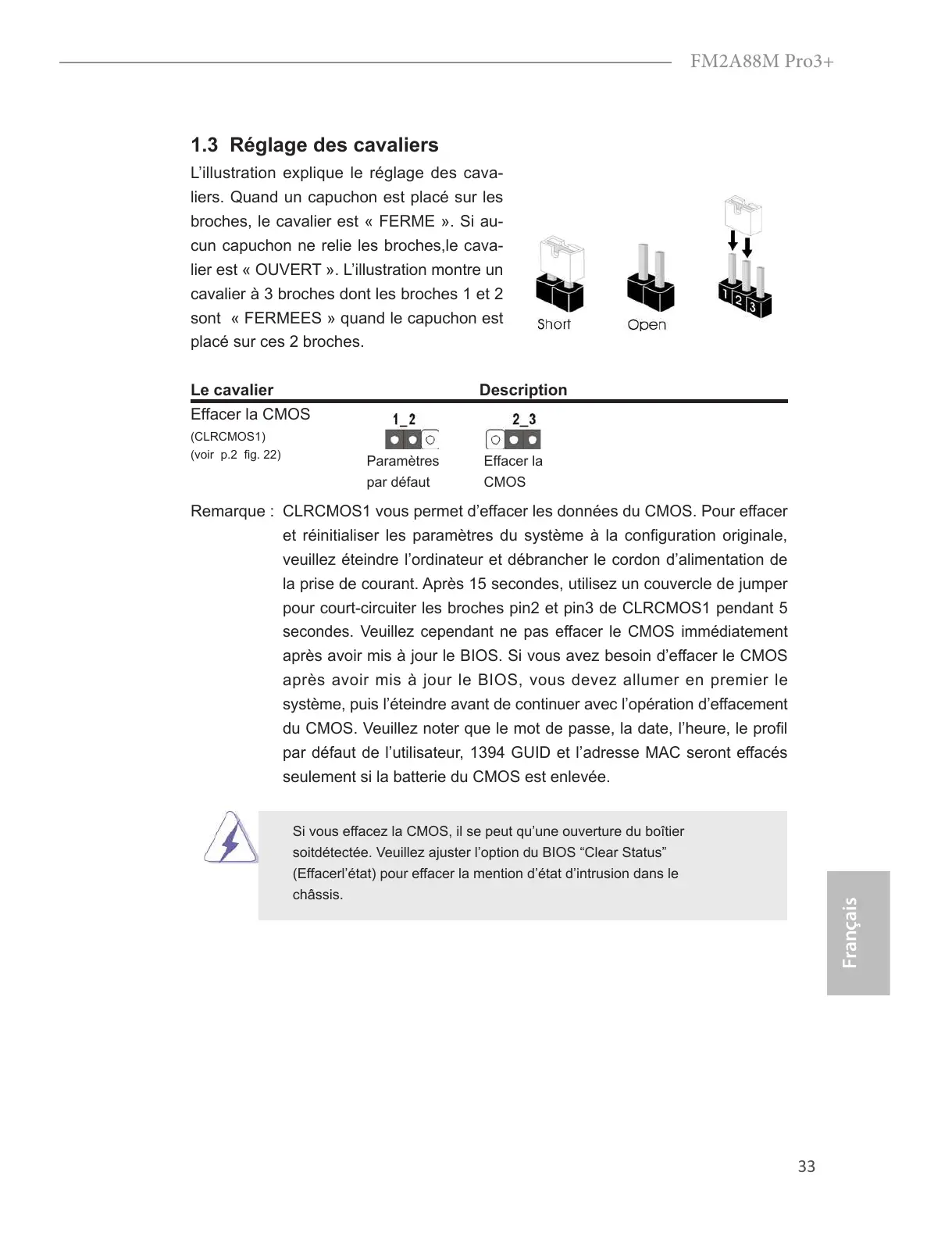 Si vous effacez la CMOS, il se peut qu’une ouverture du boîtier